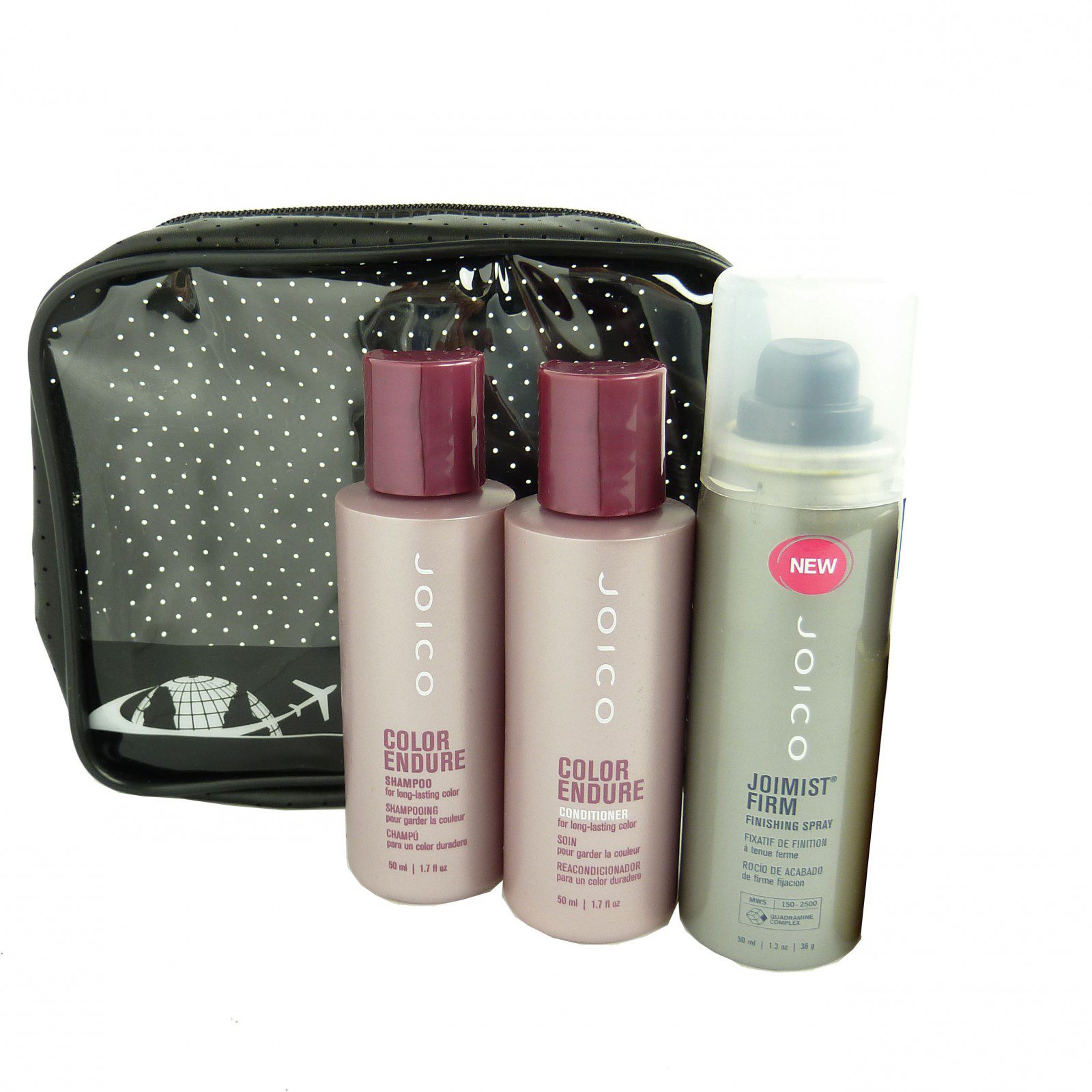 Inszenieren Sie Ihre Haare auch auf Reisen immer glanzvoll: mit dem Joico Reise-Set für stilvoll gefärbtes Haar. Waschen, pflegen und stylen Sie Ihre Haare mit den Qualitätsprodukten aus diesem einmaligen Reiseset. Beginnen Sie Ihr Pflegeprogramm mit dem Color Endure Shampoo, welches Sie zum Waschen der Haare verwenden. Anschließend verwöhnen Sie das Haar mit dem Color Endure Conditioner und dem K-Pak Color Therapy Restorative Styling Oil. Zum Abschluss können Sie der Frisur noch den perfekten Sitz mit dem Joimist Firm Finishing Spray einverleiben.