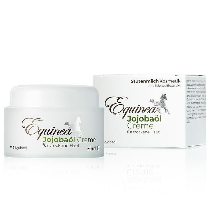 Aeusserst vielseitig ist die Equinea Stutenmilch Jojobaoelcreme. Sie zieht gut ein und erfrischt trockene und muede Haut. BIO Stutenmilch, Edelweissextrakt, Jojobaoel, Squalan, Bienenwachs und Lanolin bieten Schutz und nachhaltige Pflege. Die Jojobaoelcreme schuetzt die Haut vor Kaelte und hilft bei sehr tro…